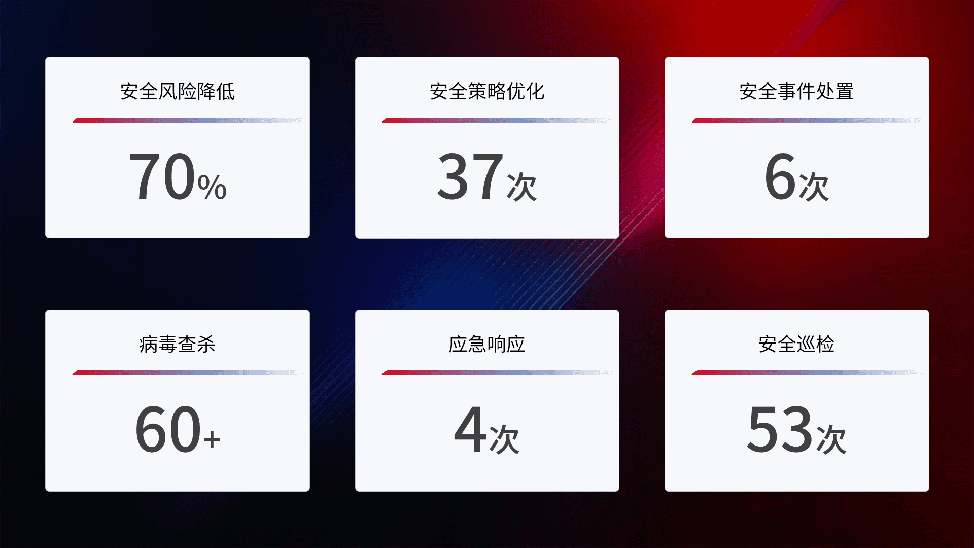 提供全面的安全事件报告体系,,,包括处置报告、、周报、、、季度和年度总结,,,结合持续监控,,帮助客户深入了解网络安全状况。。。。